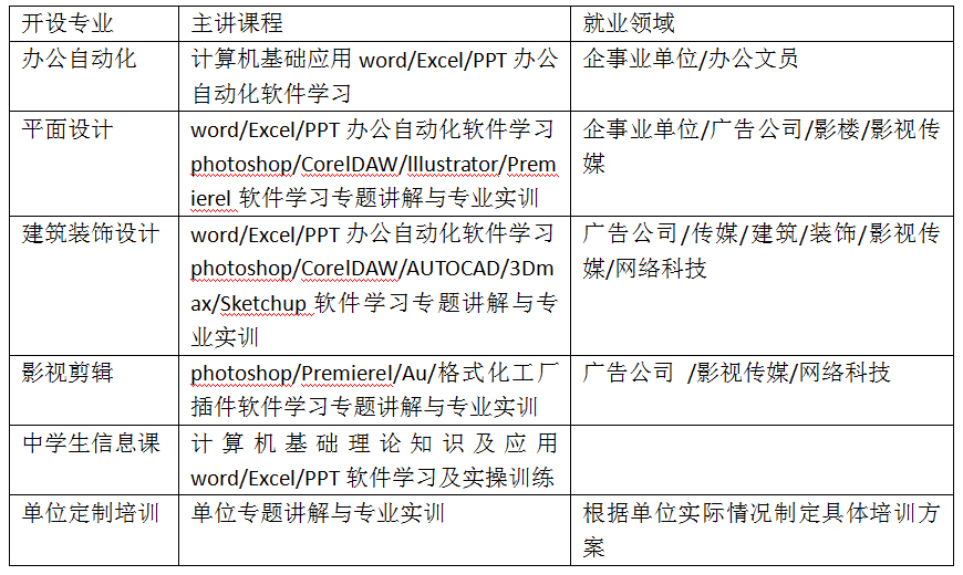 專業(yè)設(shè)置 辦公自動(dòng)化 計(jì)算機(jī)“零"基礎(chǔ)知識(shí)學(xué)習(xí),標(biāo)準(zhǔn)輸入法/文字排版/表格制作/幻燈片制作 廣告設(shè)計(jì) 文字排版/表格制作/圖片繪制/特效合成/平面廣告設(shè)計(jì)制作/實(shí)訓(xùn) 影視制作 傳媒影視編輯/視頻剪輯/合成/調(diào)色特效/輸出/實(shí)訓(xùn) 建筑裝飾 效果圖繪制/平面廣告設(shè)計(jì) 工程圖紙?jiān)O(shè)計(jì)/實(shí)訓(xùn) 1單位定制辦公培訓(xùn) 2計(jì)算機(jī)等級(jí)考試培訓(xùn) 3單位培訓(xùn) 場(chǎng)地租賃 4學(xué)生信息課 考試培訓(xùn)